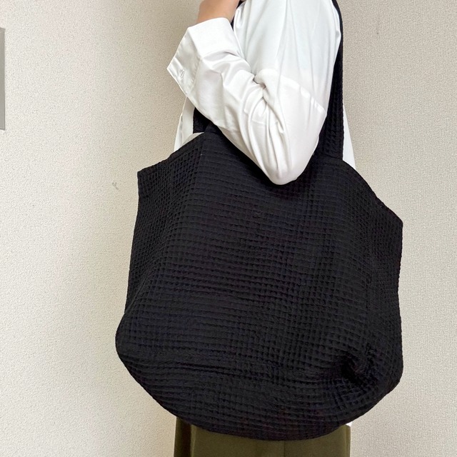 YouTubeチャンネル となりのシングルマザーのハンドメイド品です 丁寧にお作りしていますが ハンドメイド品の為、 サイズの誤差、返縫いのずれ等神経質な方はお控え下さい。 発送は折りたたんでの発送になります。 ビニールの袋にはお入れしますが完全な防水をお約束するものではありません。 ご理解お願いします。 ——サイズ—— 縦33センチ 横34センチ マチ22センチ 持ち手67センチ マチを全体的にとっているので 沢山荷物が入り、実際の縦横サイズより大きく感じます。 持ち手長めです。 黒色ですがワッフル素材なのでフワッとした印象です。