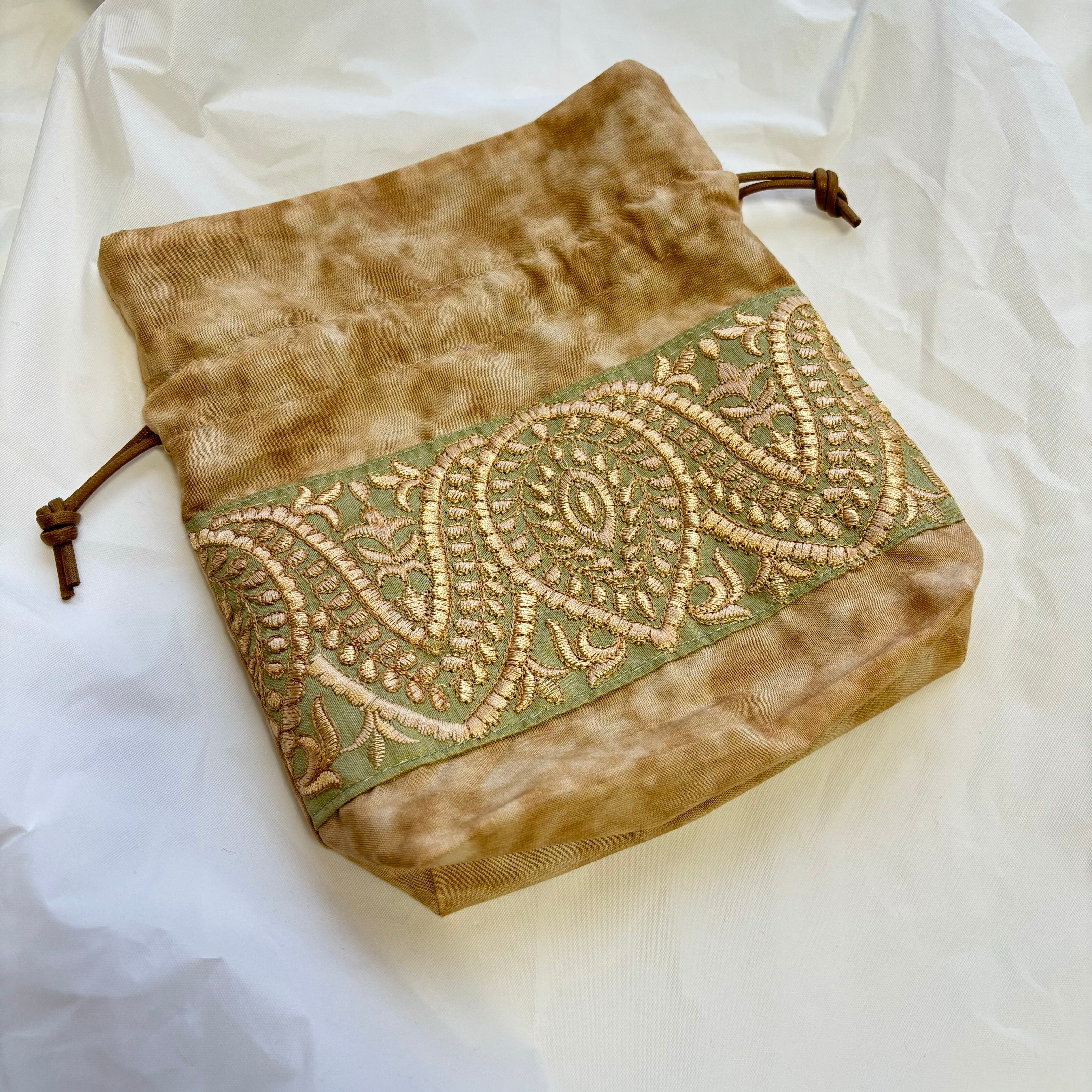 インド刺繍リボン×だいだい生地 巾着